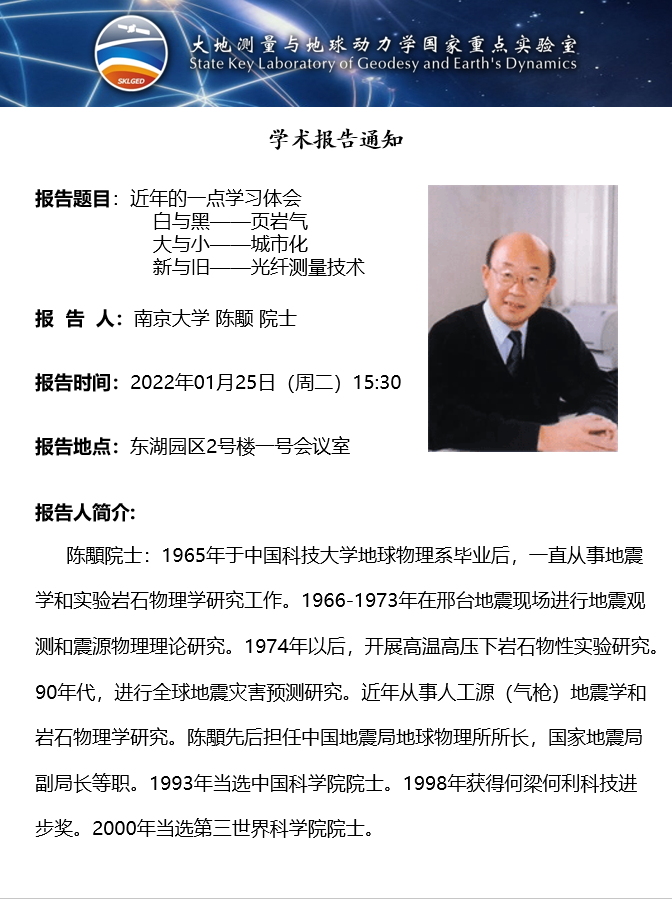 2022年1月25日尊龙凯时人生就是搏大地测量与地球动力学国家重点实验室学术预告