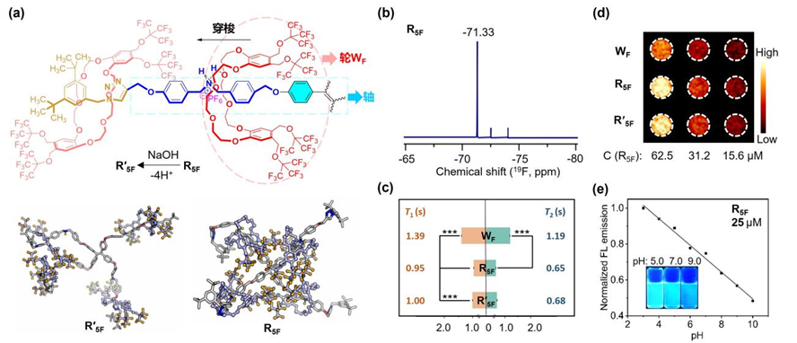 轮烷氢键断裂导致的构象变化(a);R5F的19F NMR(b);轮WF、轮烷R5F及R’5F的19F弛豫时间(T1和T2,c)和对应19F MRI(d);R5F的pH响应FLI(e)
