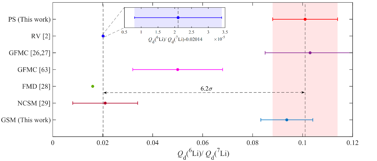 研究团队基于自主研制的亚稳态锂离子束源装置,在前期饱和荧光光谱方案的基础上,首次将光学Ramsey方法应用于离子束流测量,将谱线半高宽从50 MHz压缩至5 MHz,最终使Li⁺超精细结构光谱的测量精度从50 kHz提升至10 kHz,精度较国际上其他团队已发表的结果提高了1至2个数量级。顺利获得高精度理论计算,研究团队进一步直接从原子光谱中提取了锂的核参数。结果显示,⁶Li电四极矩的测量值与现有推荐值存在显著偏差,但与Gamow壳模型的核结构理论计算结果一致。图1展示了采用多种方法得到的⁶Li与⁷Li核电四极矩的比值。